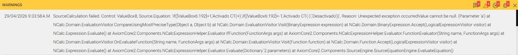 Hello, A few days ago, this error message started appearing in some of our Axiom applications, where I display value boxes with conditions (an “if” equation in a calculate control) that depend on the…