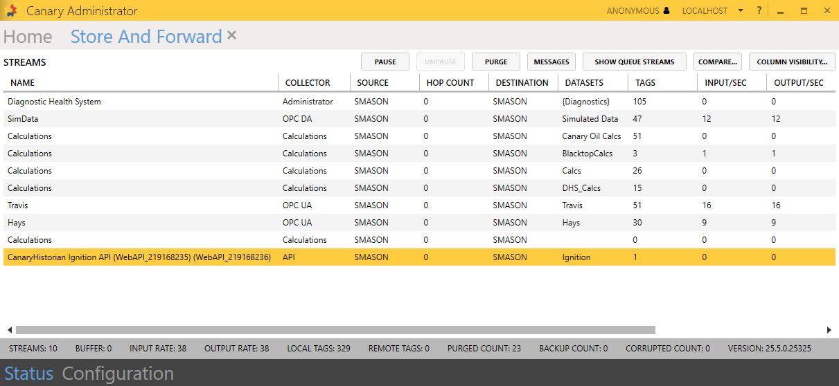 As soon as an enabled tag updates, a data stream will appear in the local Store & Forward service with the name '[historianName] Ignition API'. Tags are not added to the data stream until there is an update based on their Sample Mode and Deadband settings.