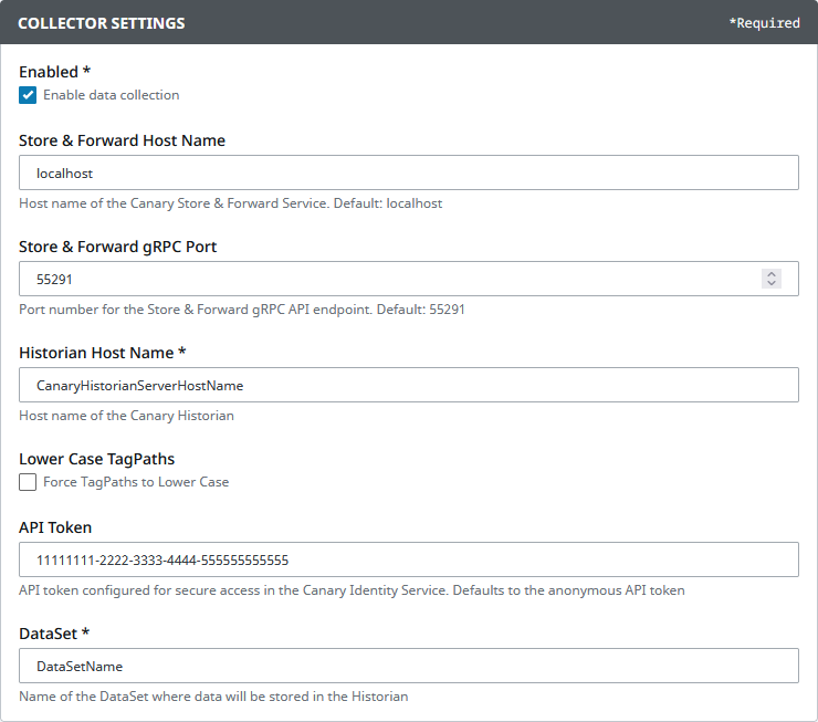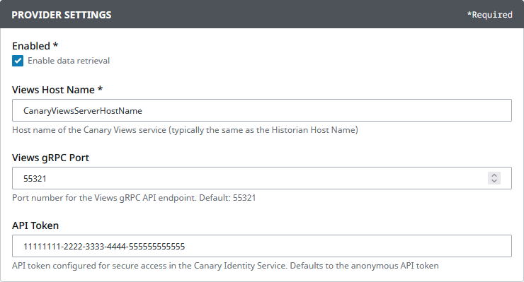 - API Token - token used for secure read/write access to the Historian when Tag Security is enabled. This can be the same token that is configured in the COLLECTOR SETTINGS. (If no token is provided, the Provider will default to the Anonymous token and require the Anonymous provider be enabled in the Identity>Configuration>Providers screen.)