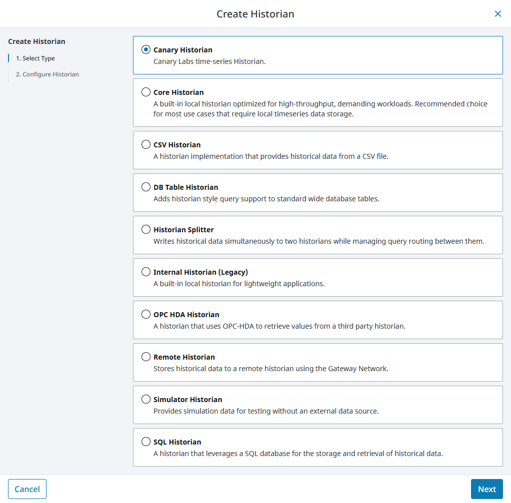 - Once the Gateway is restarted, navigate to the Services>Historian screen and select CREATE HISTORIAN+. Select Canary Historian from the list and click Next.