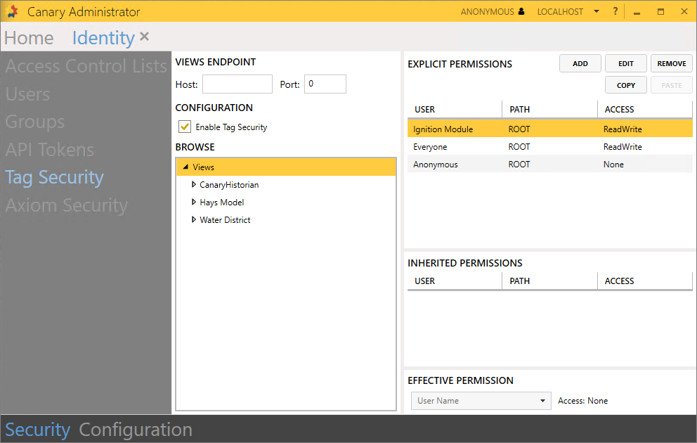 - API Token - token used for secure read/write access to the Historian when Tag Security is enabled. Tokens are generated and managed within Canary's Identity service. The Canary user linked to the token should have ReadWrite access to the root View within the Identity>Security>Tag Security screen.