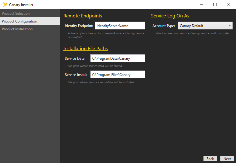- Set the Identity Endpoint to the machine name of where the Identity service is installed. This is almost always the Canary Historian server. Configure the installation locations or take the defaults. Click Next to review the components to be installed, then Install.