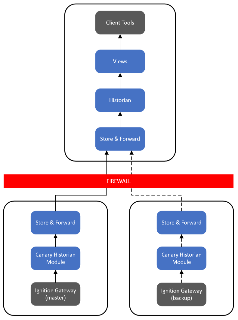 If using a “cold” or “warm” backup Ignition gateway, the Canary Historian module is installed on both gateways so that data can continue logging when a failover from master to backup occurs; however, this environment does have its limitations. See How to Configure the Ignition Collector for more details.