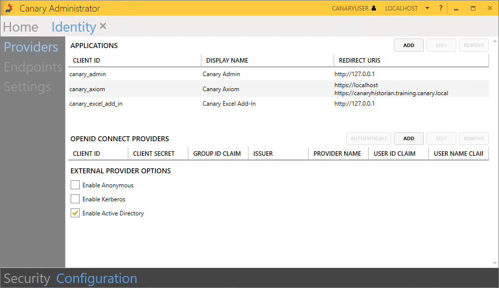 If you want to enable an alternative method for logging into Canary's software, open the Identity tile and select the Configuration tab at the bottom.