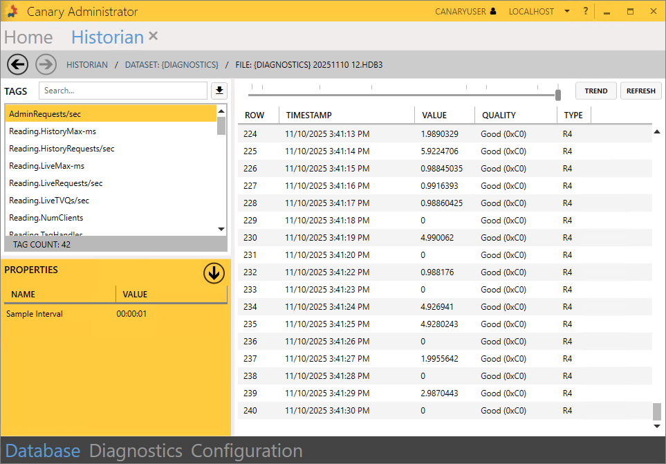 The Historian tile will contain the DataSets (which act like folders) that store the data coming from the Collectors. By default, a {Diagnostics} DataSet is created which contains system performance tags. You can drill all the way down to the tag level by opening the DataSet, then the daily file that is being currently written to, followed by the tags themselves. Selecting a tag from the list on the left will reveal its updates or TVQ's (timestamp value quality) on the right.