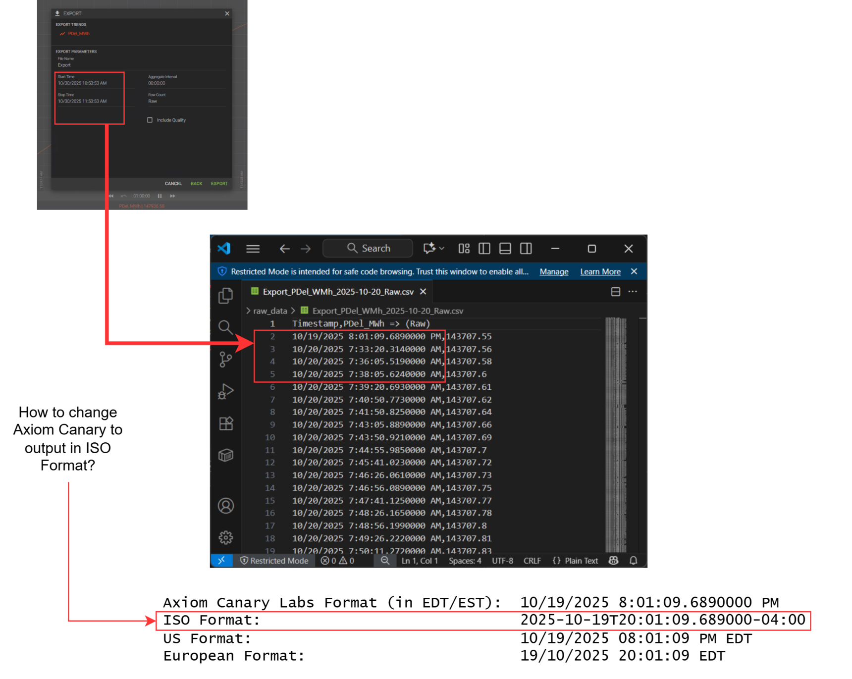 How to configure Axiom Canary Labs to export in ISO Time Format?