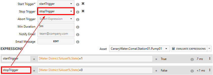 - Optional - Create an expression to serve as the Stop Trigger to conclude the event whenever the condition is true. Assign the variable to the Stop Trigger. If a Stop Trigger is not configured, the event will conclude whenever the Start Trigger evaluates false.