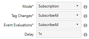 - Determine the Mode by which the event will be evaluated. Subscription modes will evaluate whenever the input tags and/or related events used to create the expression(s) change. Periodic modes will evaluate at set intervals (i.e. 1day, 1hour, etc.). If choosing a Subscription mode, the user can determine which Tag Changes to subscribe to: All, Some, or None. If choosing None, the event will only be evaluated whenever a related event (parent or child) is evaluated using the Event Evaluations drop-down. Event Evaluations are only possible if using the following functions in the expression(s): Event_GetActiveCount, Event_GetAssetInstanceCount, Event_GetCompletedCount, and Event_GetParentVariable. If these functions are not used, the event can only be triggered by tag input changes.