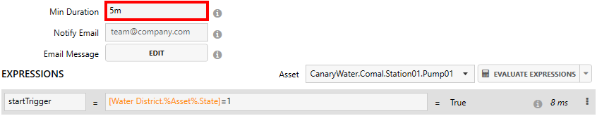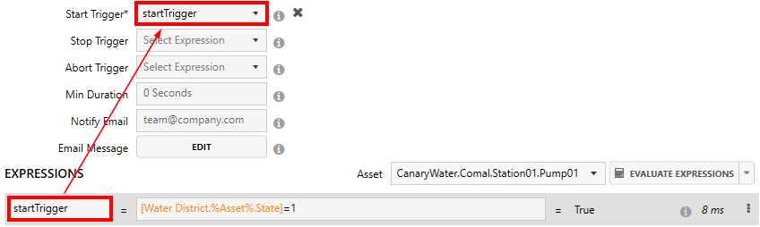 Set the expression equal to a variable key using the box on the left (i.e. "startTrigger") and assign the variable to the Start Trigger. - Optional - Set a Min Duration for the amount of time that must elapse while the defined Start Trigger is true before being considered an event. In this example, the [State] tag must equal 1 for at least 5 minutes before the event is triggered.