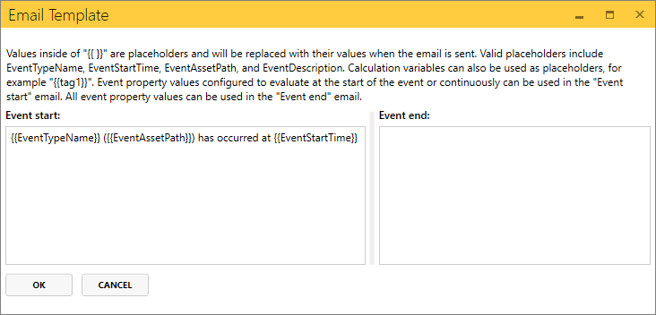 - Optional - Click the EDIT button if wishing to format the email notification that is sent when the event occurs. By default, an email is only sent when the event is triggered. If wishing to send a notification when the event concludes, the Event end email must be formatted.