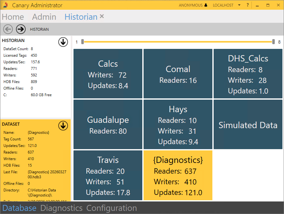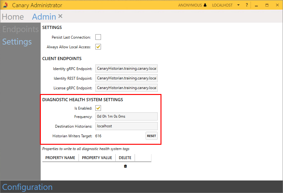 Canary provides diagnostic health tags used for monitoring system performance and individual Canary service metrics. These tags are enabled through the Admin tile>Settings screen and are written to the {Diagnostics} DataSet.