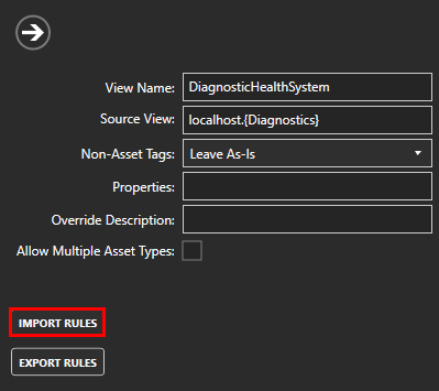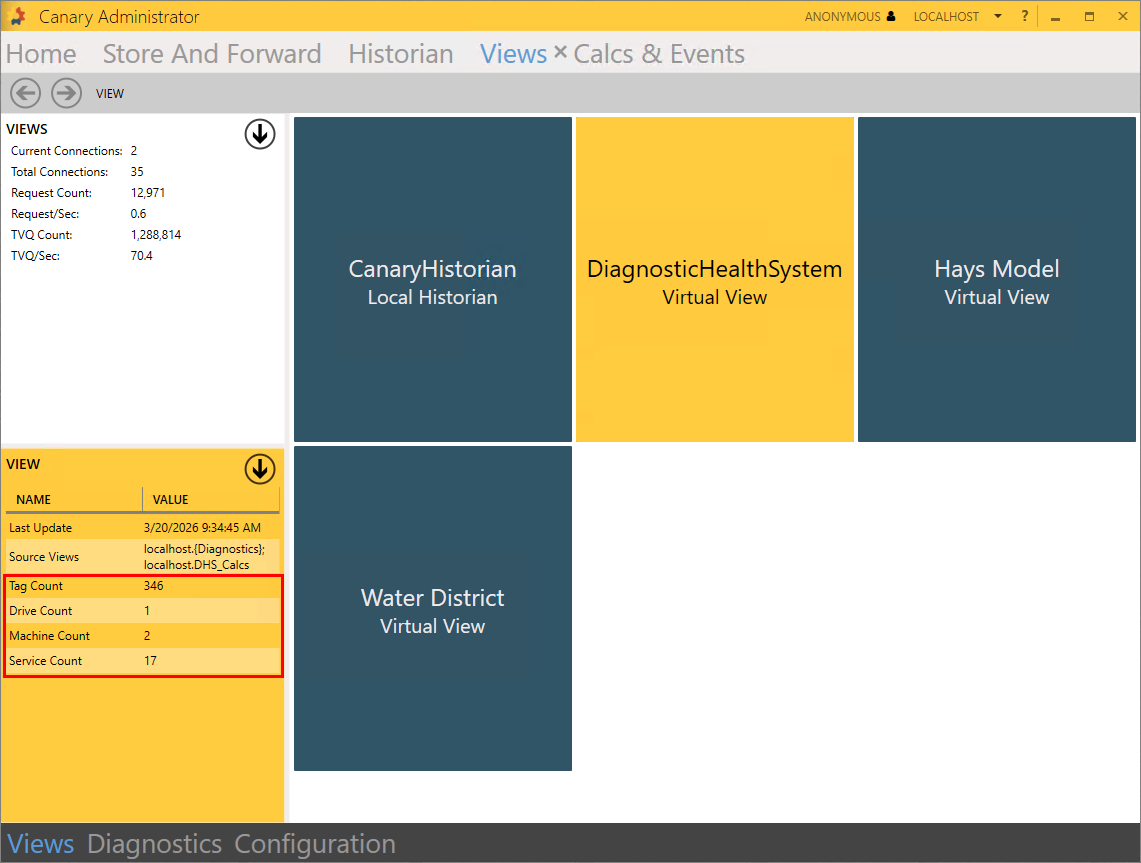 - CLOSE the edit screen. A tile for the DiagnosticHealthSystem view should appear with its information displayed in the VIEW panel in the bottom-left. The tag count and asset count will vary depending on the number of Canary servers and services installed.