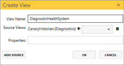 - Configure the View Name, DiagnosticHealthSystem (case-sensitive), and select the {Diagnostics} DataSet from the Source Views. Click OK.