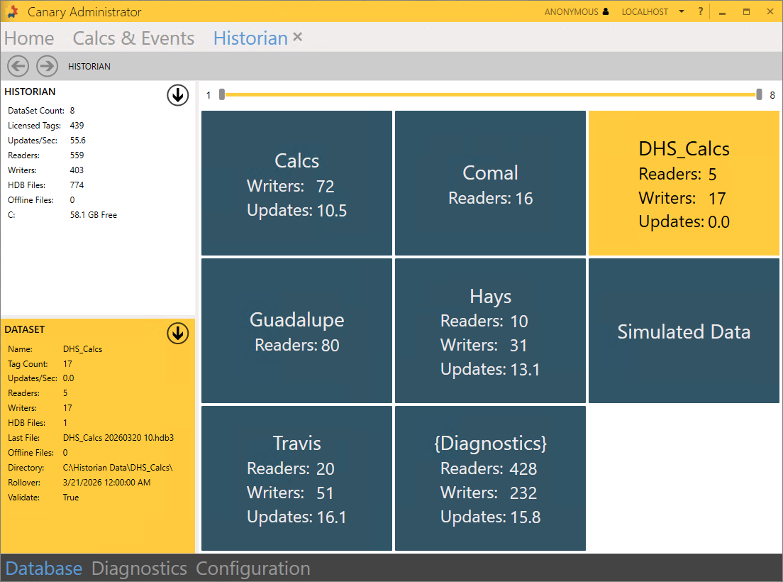 - Verify the DHS_Calcs DataSet appears in the Historian. These tags do consume a tag license.