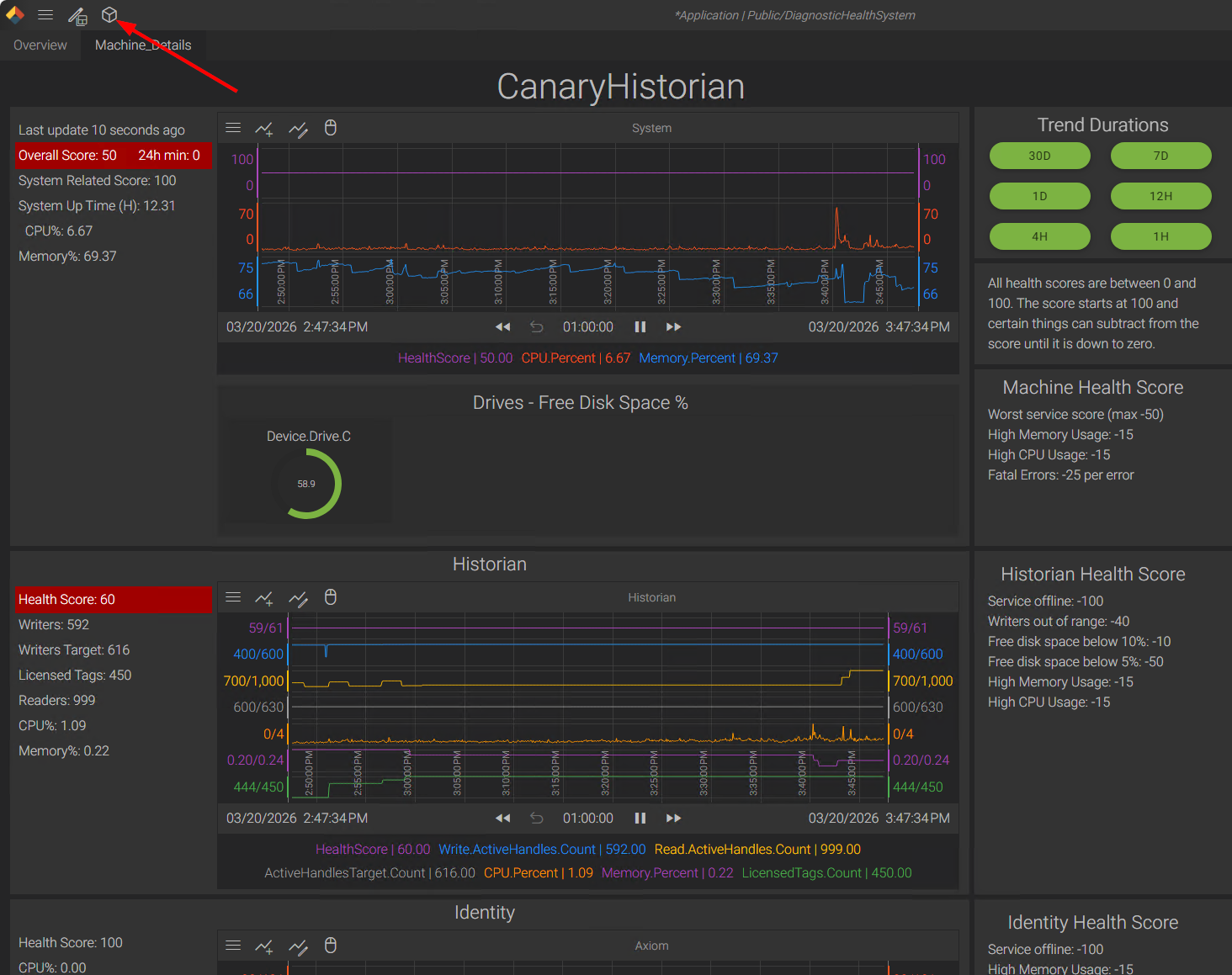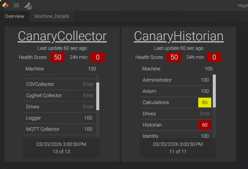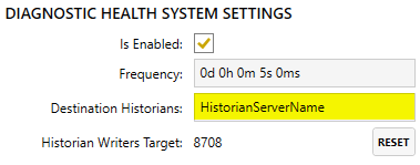 Enable the Diagnostic Health System (DHS) tags on each Canary server. Collector and ancillary servers will need to have their diagnostic tags routed to the Historian server by updating the Destination Historians field.