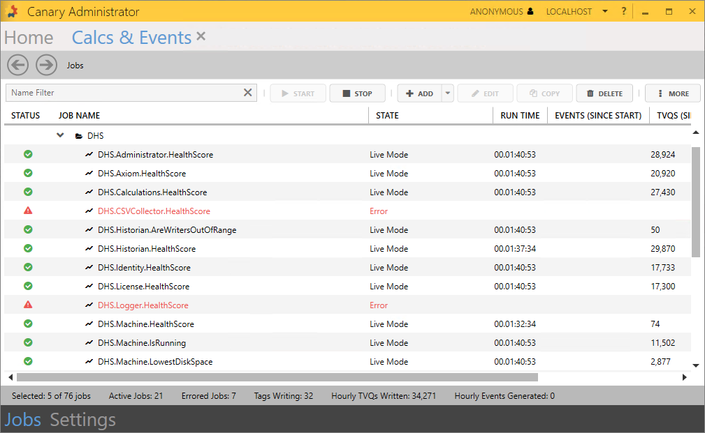 The calculated tags created here are used to determine a Health Score for a Service and a Machine. These, in turn, will be used to display alerts within the Axiom application created in the next section. Calc tags will be written to the DHS_Calcs DataSet within the Historian.