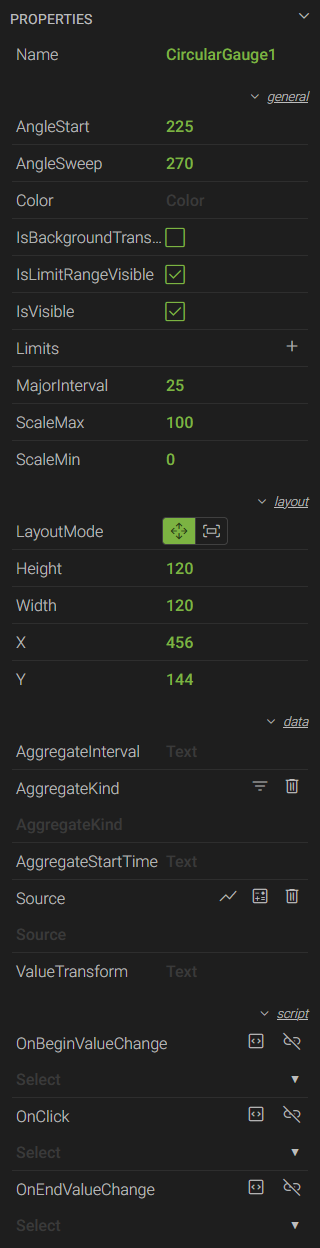 - IsLimitRangeVisible - a checkbox to show/hide limit(s) if configured. If enabled, the needle will change color when a limit is exceeded.