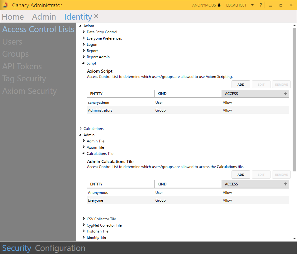 | Identity-User Impersonation | Controls who is allowed to impersonate other users. This is only used if the Axiom service is installed remotely from the Identity service. In this case, the Axiom service uses the account to impersonate other users when running Automated Reports. By default, a preconfigured Canary user, Axiom Report Service Account, is placed on this list. This user is linked to an API token which would need added to the remote Axiom service within the Axiom tile>Configuration>Settings>Identity Application Token. |