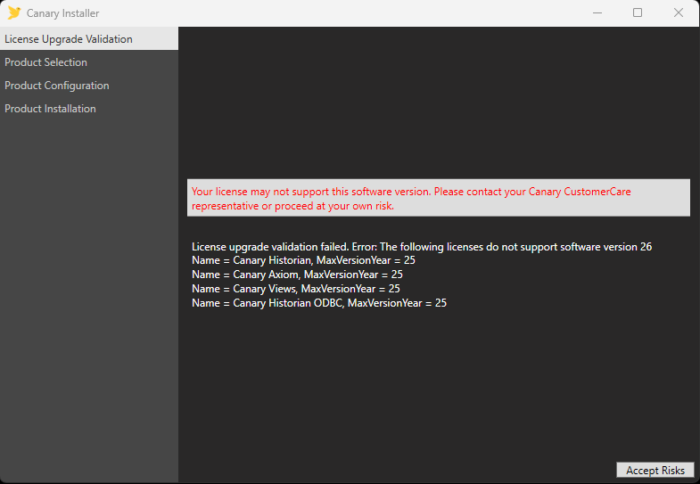 "Your license may not support this software version. Please contact your Canary CustomerCare representative or proceed at your own risk."