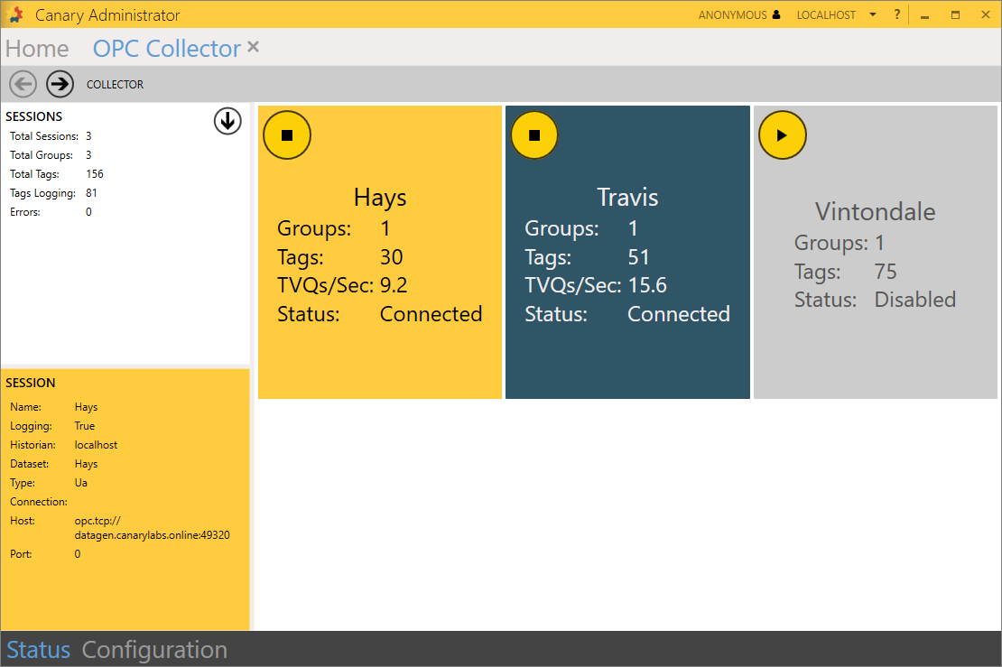 The Status screen contains information for all sessions configured within the Collector. The right side displays a tile for each session configured - a blue tile if the session is active or gray if inactive. The selected session is yellow.