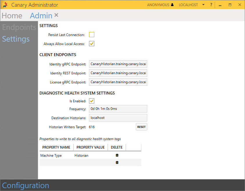 - Remote Enabled - True or False, if the Admin service allows a remote Canary Admin client connection
