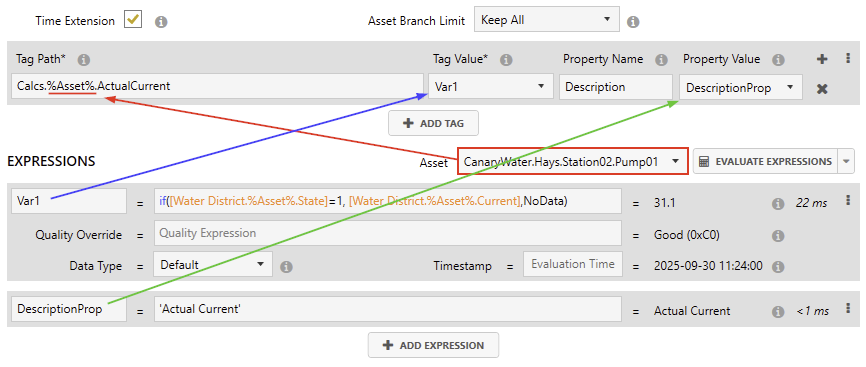 If the calculation is asset-based, the wildcard %Asset% must be included in this path as seen in the screenshot above. This wildcard will be populated for each asset path listed in the Asset drop-down menu, assuming each asset instance has the required tag(s) from the expression to output a result. - Tag Value - the variable of the expression whose result is written to the output tag