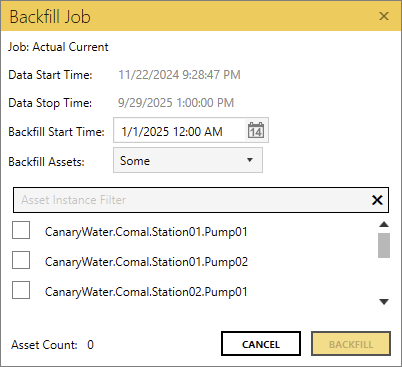 If a job is asset-based, the user will see the Backfill Assets option to backfill all or some asset instances. If Some is selected, the user can filter the list using keywords separated by spaces and select the instances to be backfilled. Keywords can be prepended with an exclamation mark (!) to exclude them from the search.