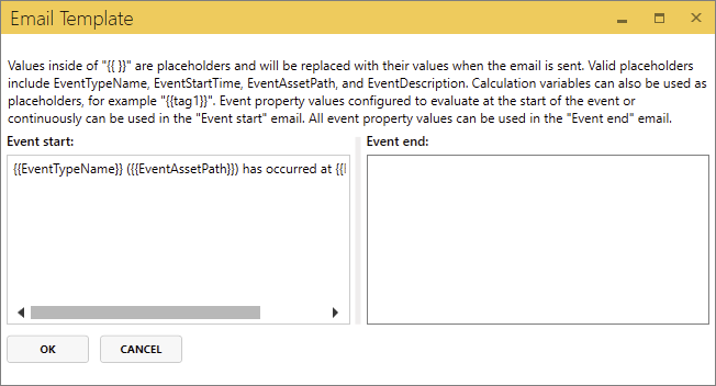- Email Message - opens the Email Template screen where users can customize the message that is sent when the event starts. An email message is NOT sent upon an event ending unless the Event end section is configured.