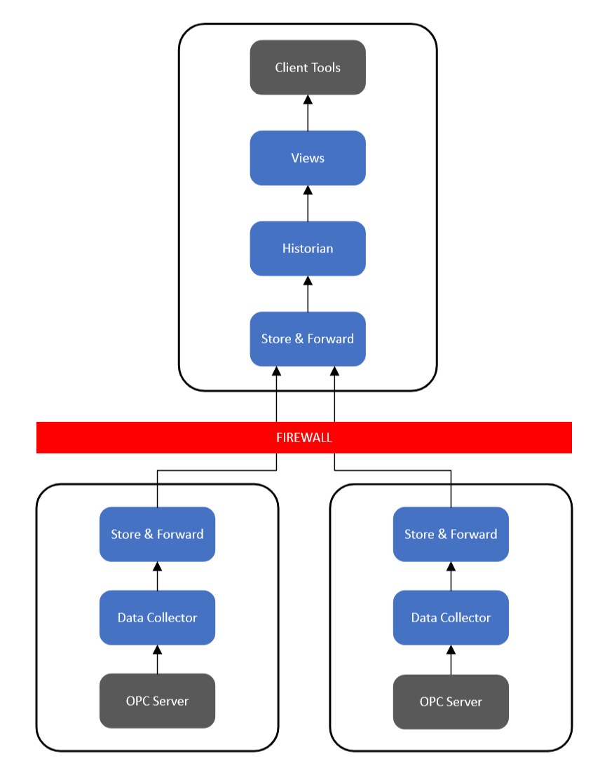 Should the value of the organization's data not be as important, the Data Collector/SaF could be installed remote from the data source on an independent machine or on the same server as the Canary Historian itself. This form of 'remote' data collection will still work without issue except in the event of a network outage or other cause of unavailability of the Historian. The option of buffering data will be unavailable.
