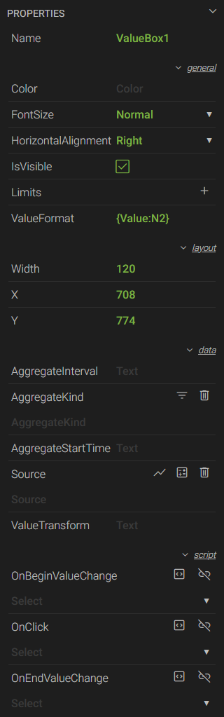- ValueFormat - determines how the value should be formatted. The user can choose to display the Value, Time, or Quality of a tag within the value box by using the respective keyword. For more information on how to format value boxes, see Value Box Formatting Options.