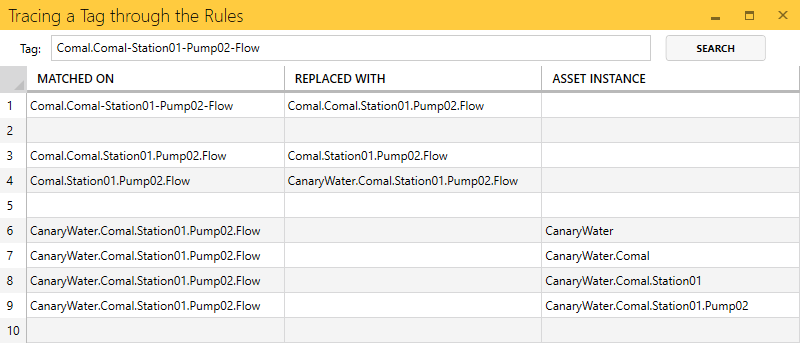 - ASSET TYPE - the asset type assigned to a particular branch within the tag path which contains the string captured in the MATCH column
