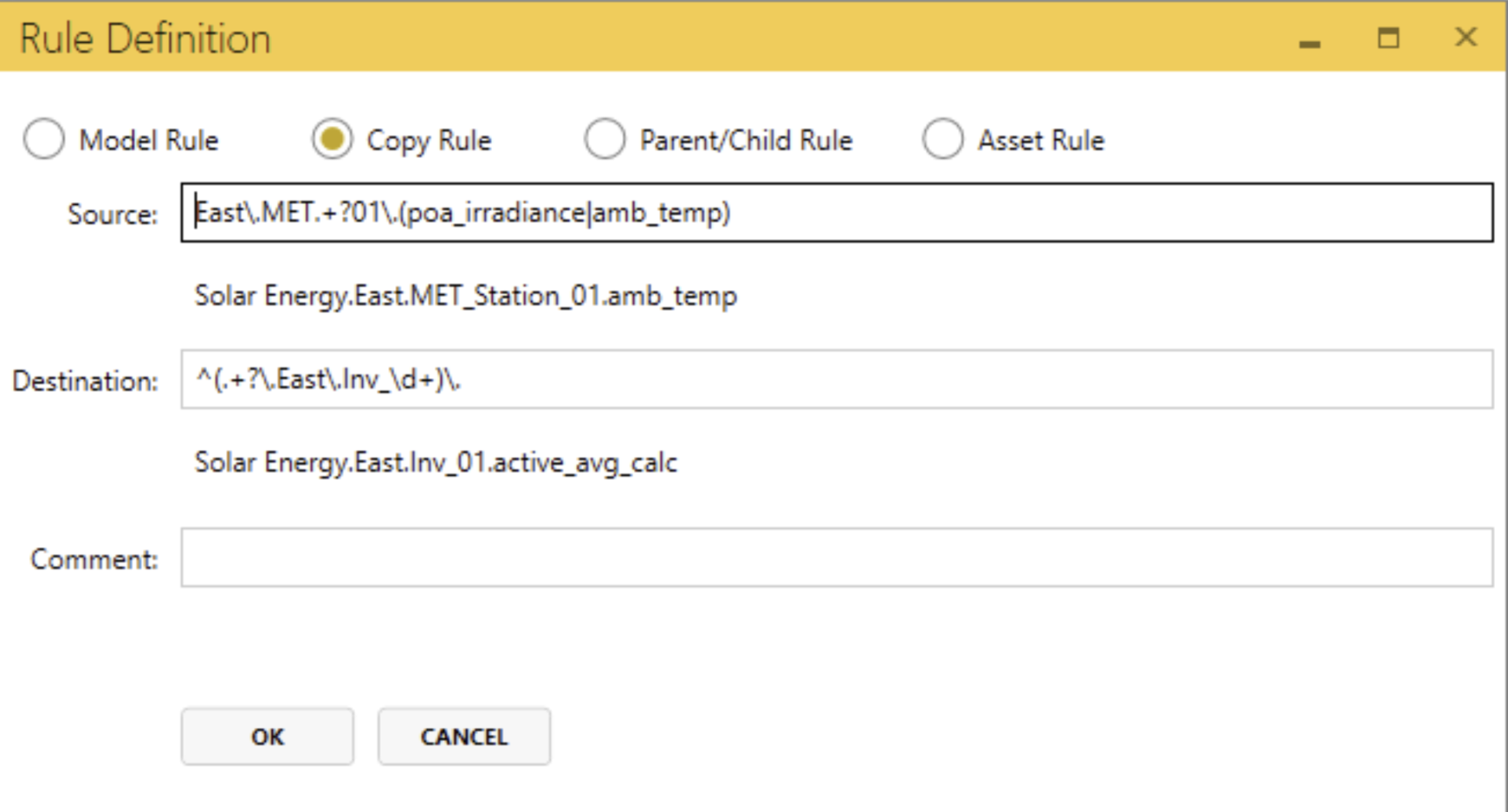 - Source - RegEx rule finding the path and tag(s) to be moved to another section of the view. In the example above, the rule is looking for any tags containing "poa_irradiance" or "amb_temp" that reside in the Solar Energy.East.MET_Station_01 path.