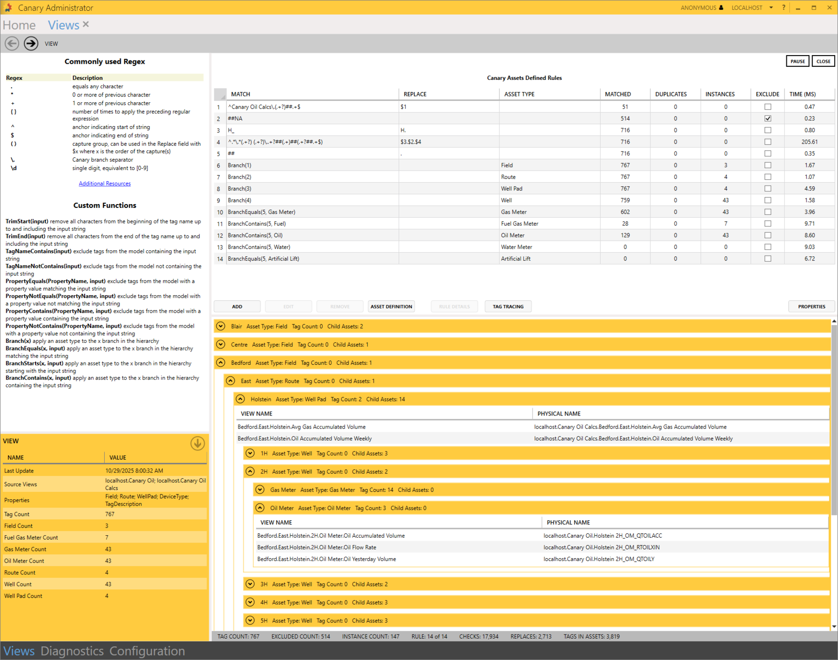Selecting the EDIT button from the VIEW OPTIONS window opens the screen to view and modify the rules used to create the Virtual View. Starting in v25.4, Commonly used Regex rules and Custom Functions are listed in the top left window.