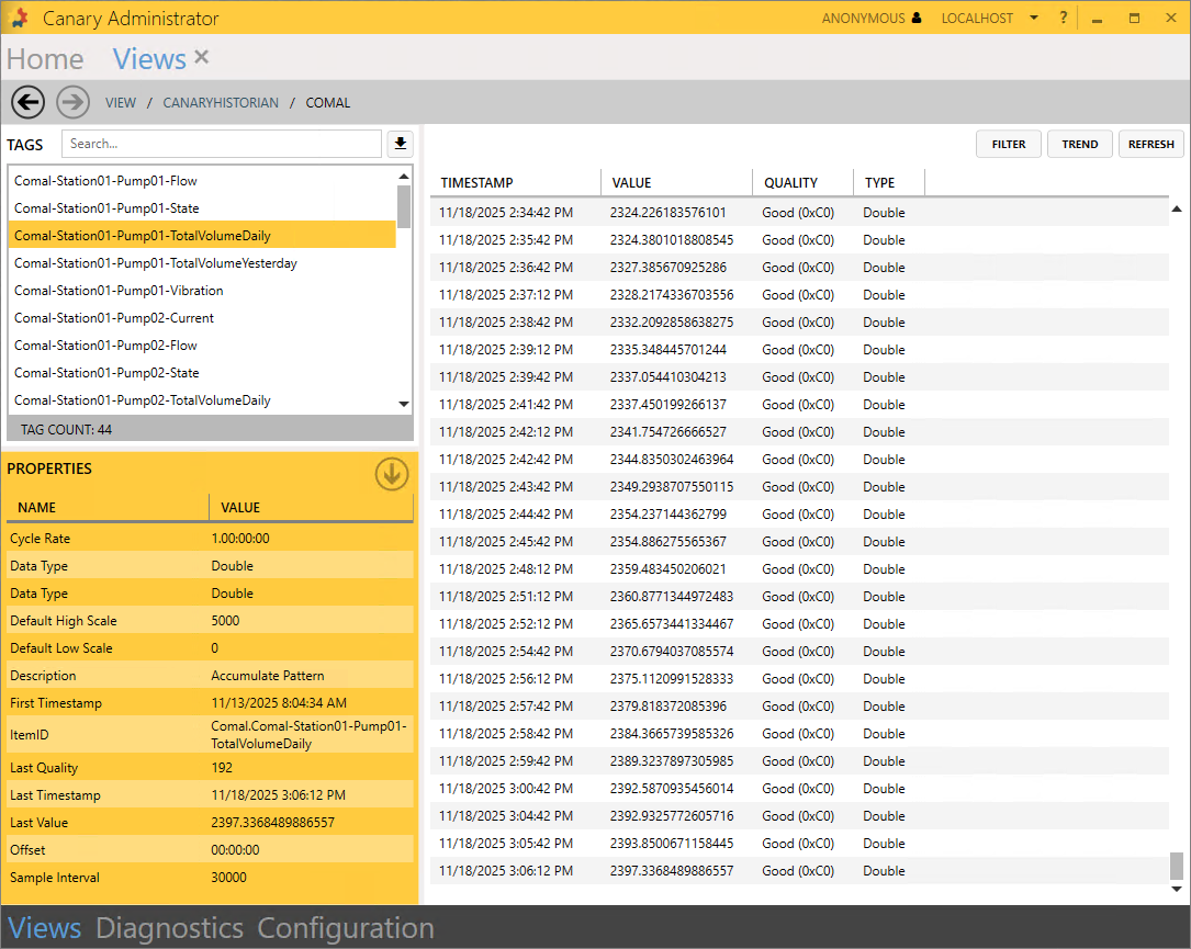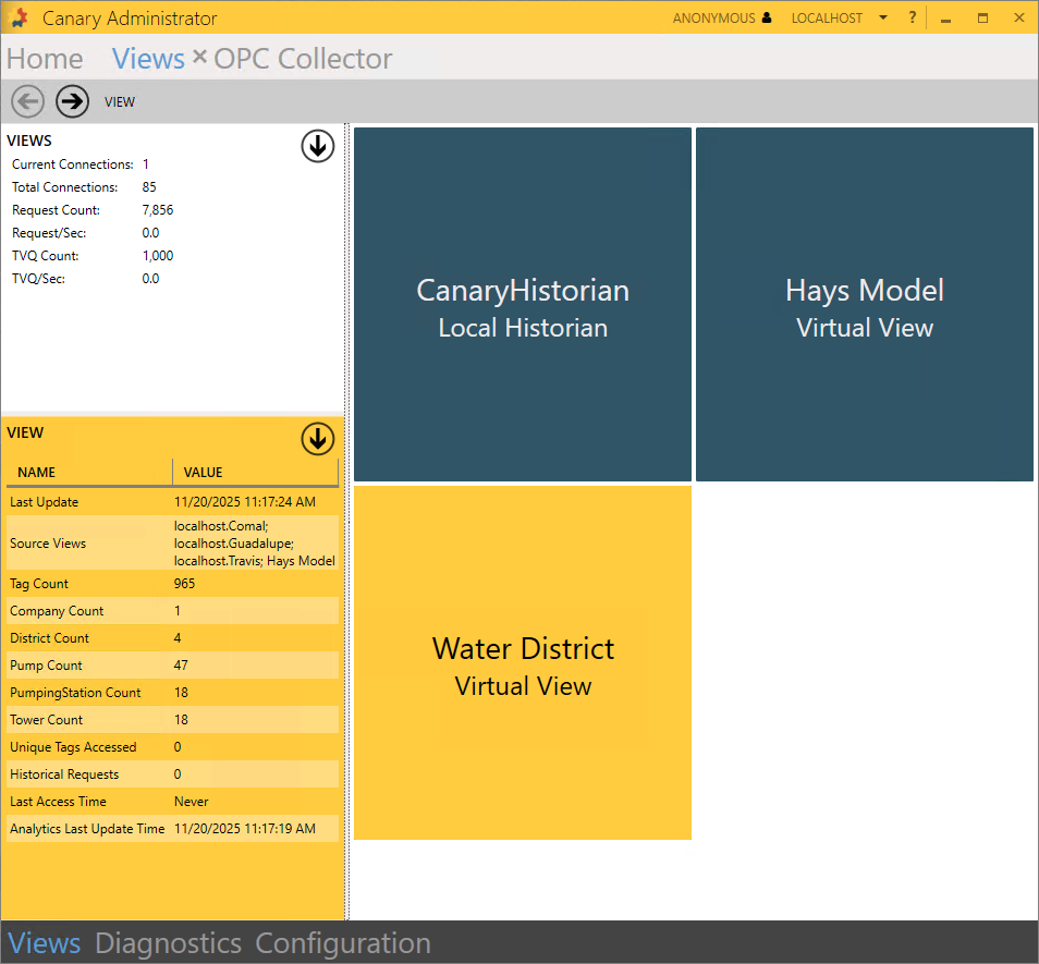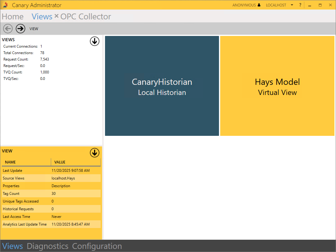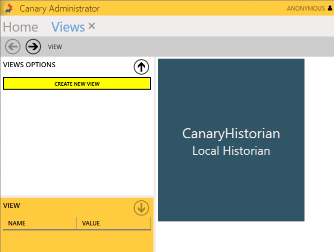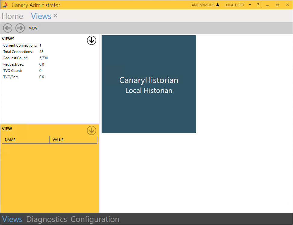 All clients wishing to consume data are routed through the Views service which acts as a gateway to the Historian. Out of the box, Canary offers the Local Historian view which you can see when you open the Views tile.