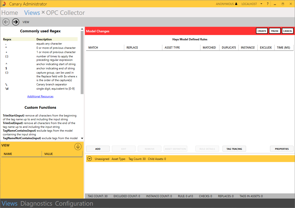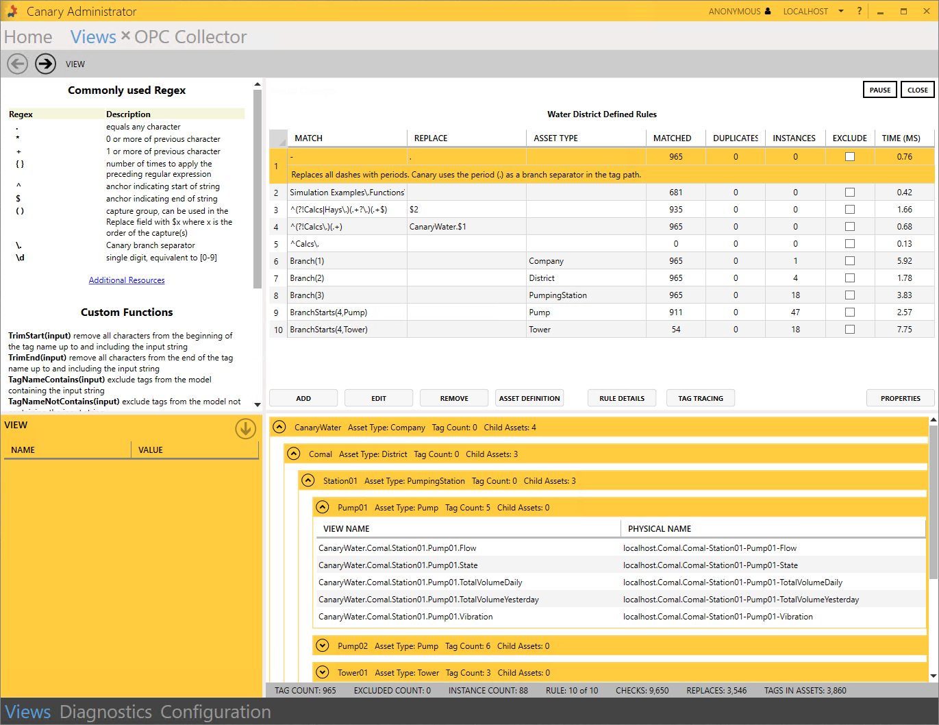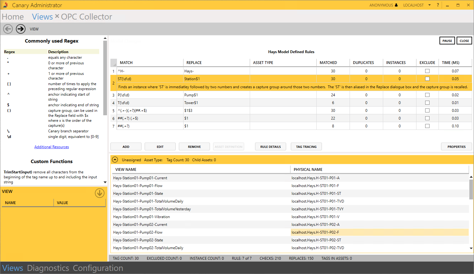 Virtual Views are built using regular expressions to find and replace string patterns found within the tag path (and the properties appended to the end of the tag path) to alter their naming convention and/or define assets. A list of commonly used regular expressions and custom functions are located in top-left window.