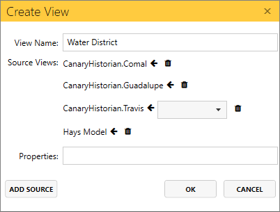 - Name the view 'Water District' and add 4 source views (Comal, Guadalupe, Travis, Hays Model) using the ADD SOURCE button and click OK. We do not need to include properties this time.