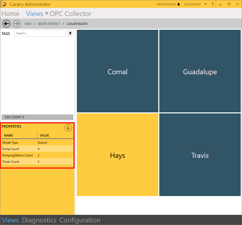 When you drill into the view, you will notice there is a screen for each branch level within the tag path. Canary uses the period (.) as a branch separator. If any tags exist at that level, they will appear in the TAGS window for the user to select. In this particular model, all of the tags reside at the very end when drilling all the way to the bottom. Selecting a tile will display its Model Type (if there is one) and any child assets that fall underneath that particular node in the PROPERTIES window.