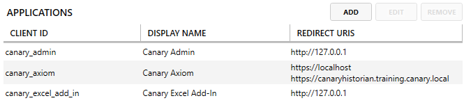 - REDIRECT URIS – the URI the user is redirected to upon connecting. The Canary Admin and Excel Add-In use the loopback IP address of 127.0.0.1 as the client is local to their machine and should not need changed. Axiom, on the other hand, is web-based. If wishing to use a different URI for users to connect to, it can be included along with the default https://localhost and https://[serverName] by editing the Axiom client application. (*Note, it is expected that the new URI is a legitimate domain which users can access.)