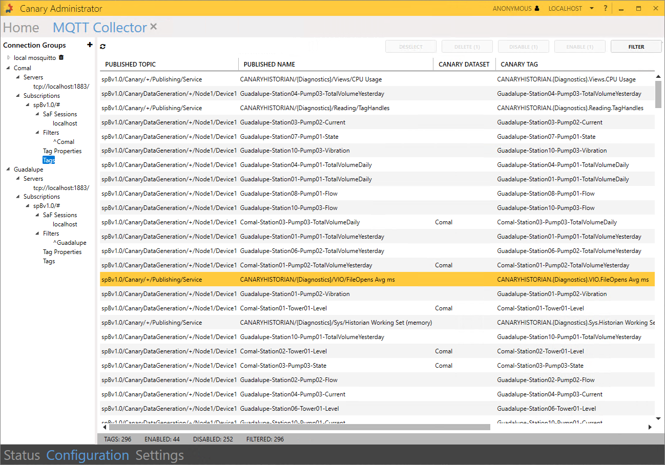 You can further verify tags are reaching the Mosquitto broker by opening the MQTT Collector tile>Configuration screen and selecting the Tags table from either the Comal or Guadalupe connection group. Since both sessions are configured to subscribe to all Sparkplug B topics within the broker, these tags should appear in the list.