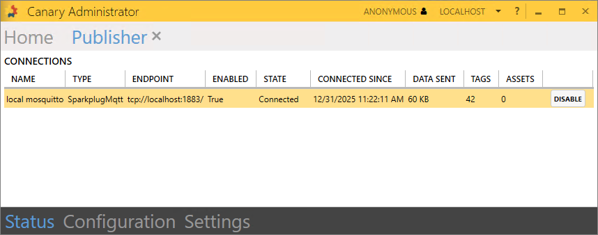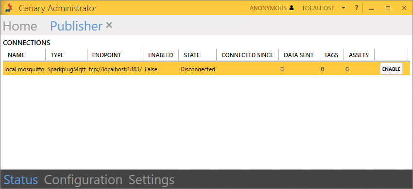 - Open the Publisher tile from the Canary Admin. By default, an example connection already exists which targets a local MQTT broker.