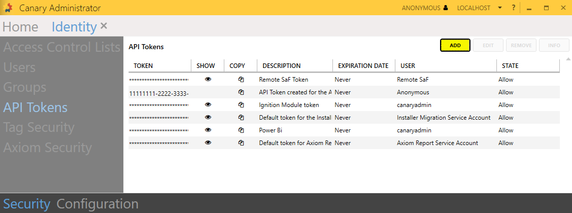 The Canary system comes with a few API tokens and their corresponding Canary users already defined: