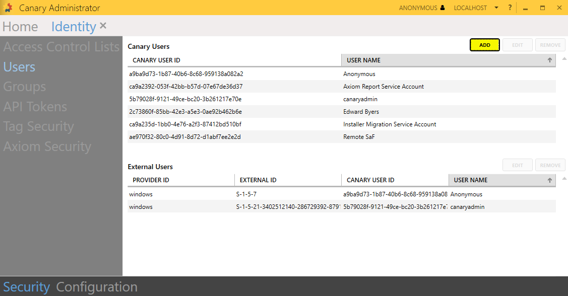 - Select the ADD button in the Canary Users section.