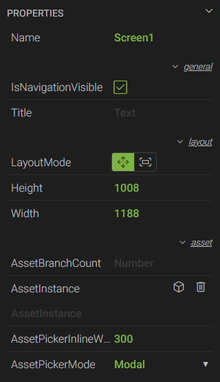 - LayoutMode - sets the size of the screen based on the Height and Width properties (Move) or fills the entire canvas within the browser window (Fill)